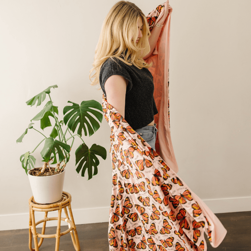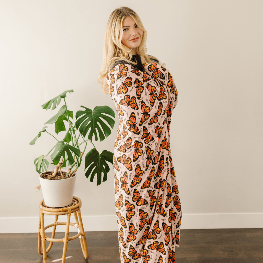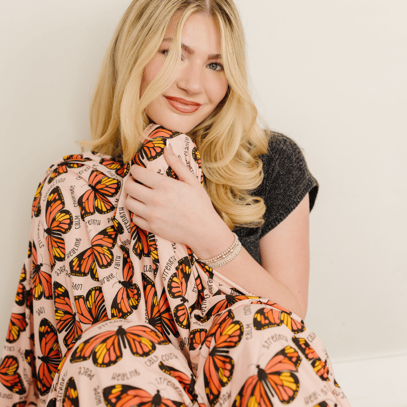 Inspired by my good friend, Brooke, The Healing Blanket is covered in graceful monarch butterflies and gentle words of strength — faith, hope, peace, courage, love, and more — each chosen to bring calm and healing energy to whoever needs it most.
