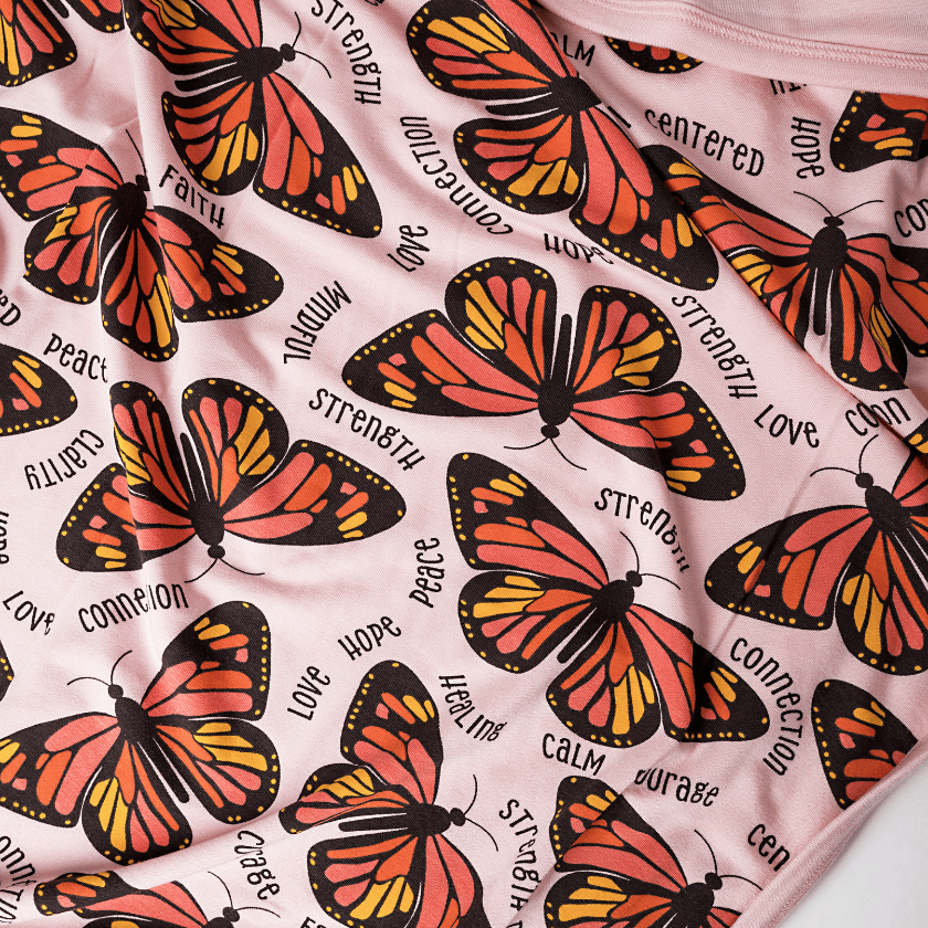 The Healing Blanket is covered in graceful monarch butterflies and gentle words of strength — faith, hope, peace, courage, love, and more — each chosen to bring calm and healing energy to whoever needs it most.